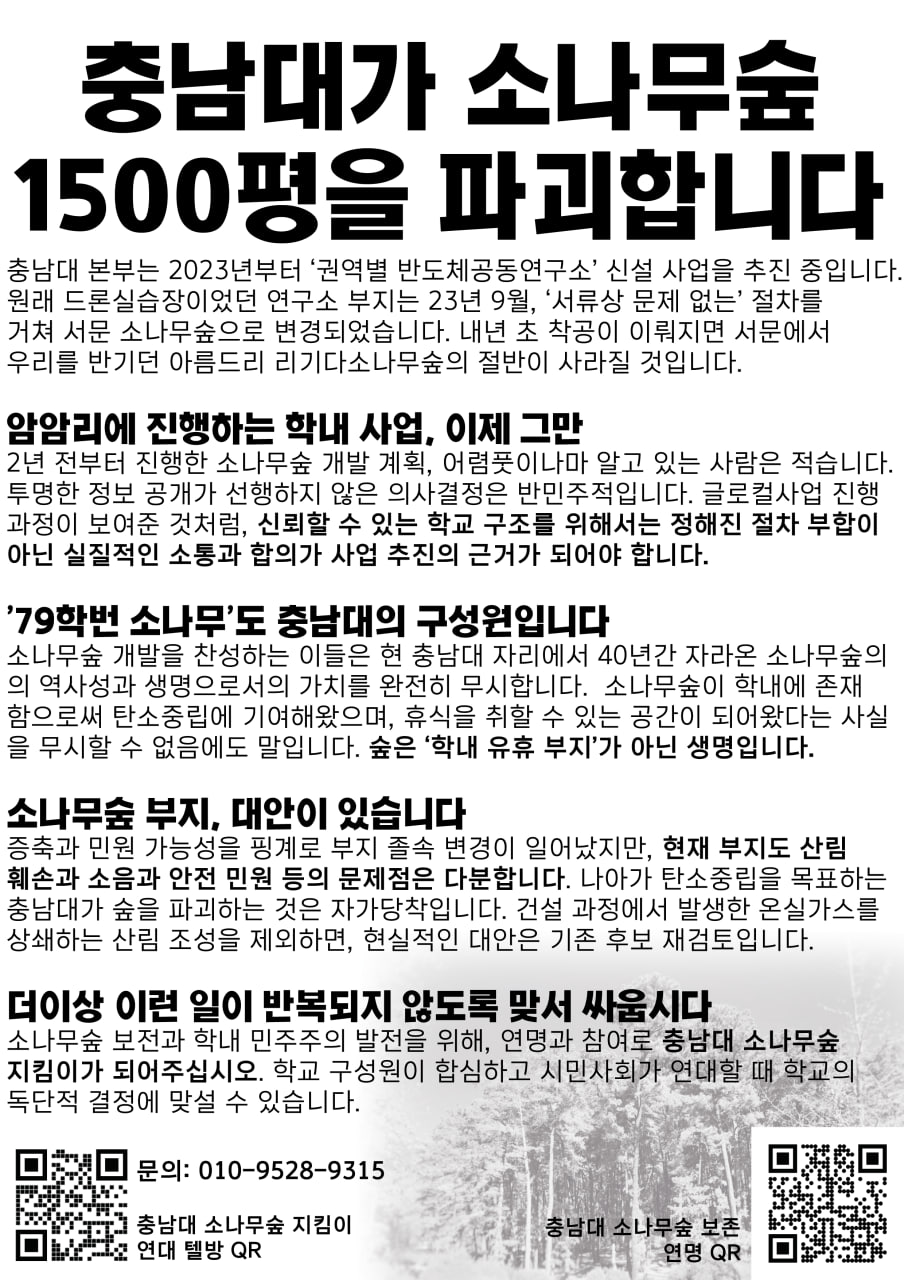 안녕하세요! 충남대 학생모임 "충남대 소나무숲 지킴이"에서 소나무숲 개발을 반대하고, 반도체공동연구소 부지 선정 재논의를 요구하는 연명을 받고 있습니다.