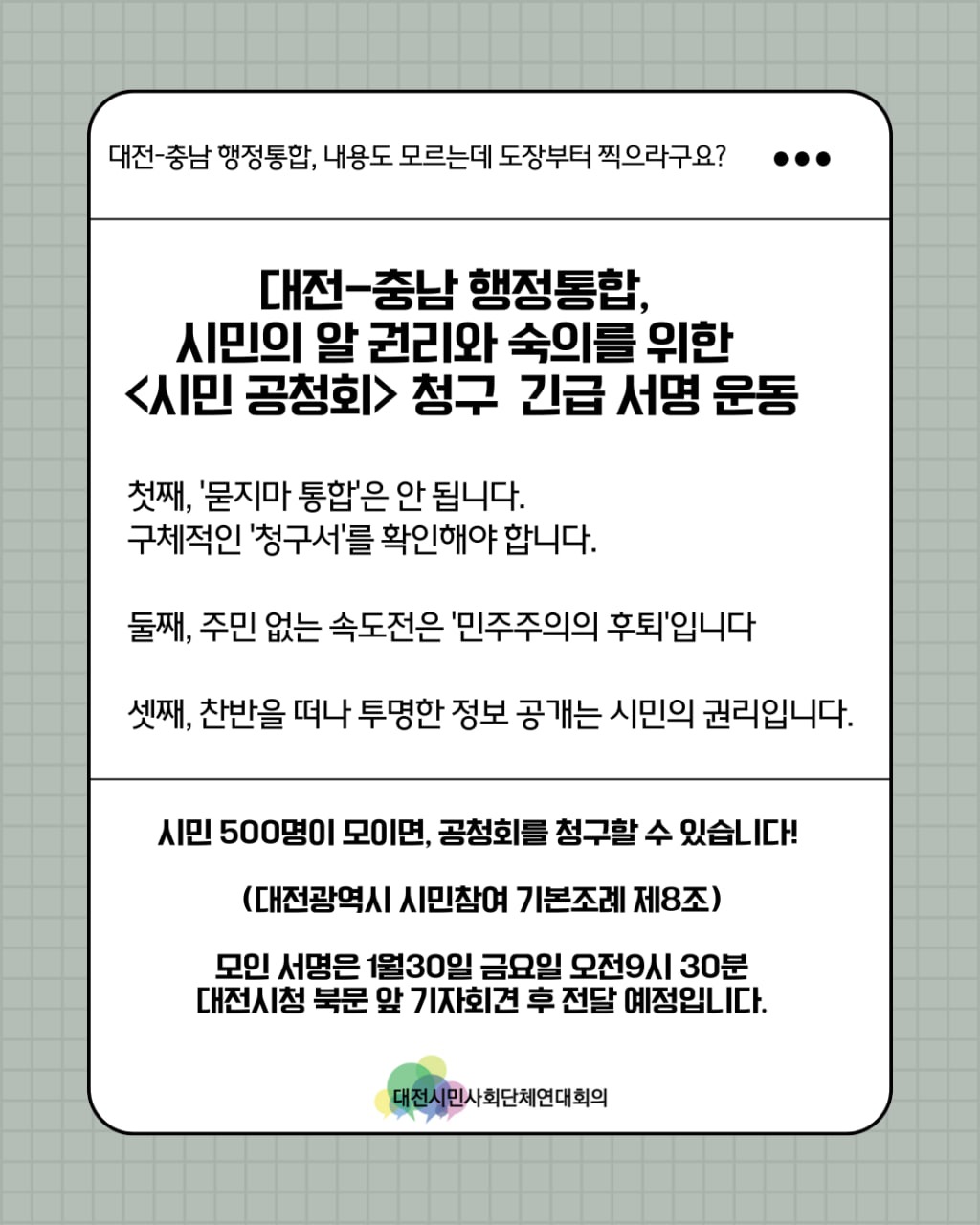 대전시와 충남도가 시작하고, 정부와 여당이 속도전을 내고 있는 지금 상황에서 통합이 되면 좋다는 장밋빛 전망만 있을 뿐, 구체적인 '청구서(비용/갈등/부작용)'는 공개되지 않았습니다. 여당에서 준비하고 있는 특별법안도 아직 공개되지 않은채로 설 연휴 전 법안 통과라는 속도전이 계속되고 있습니다. 시민의 의견 수렴 없이 정치적 일정에 쫓겨 결정되어서는 안 됩니다.