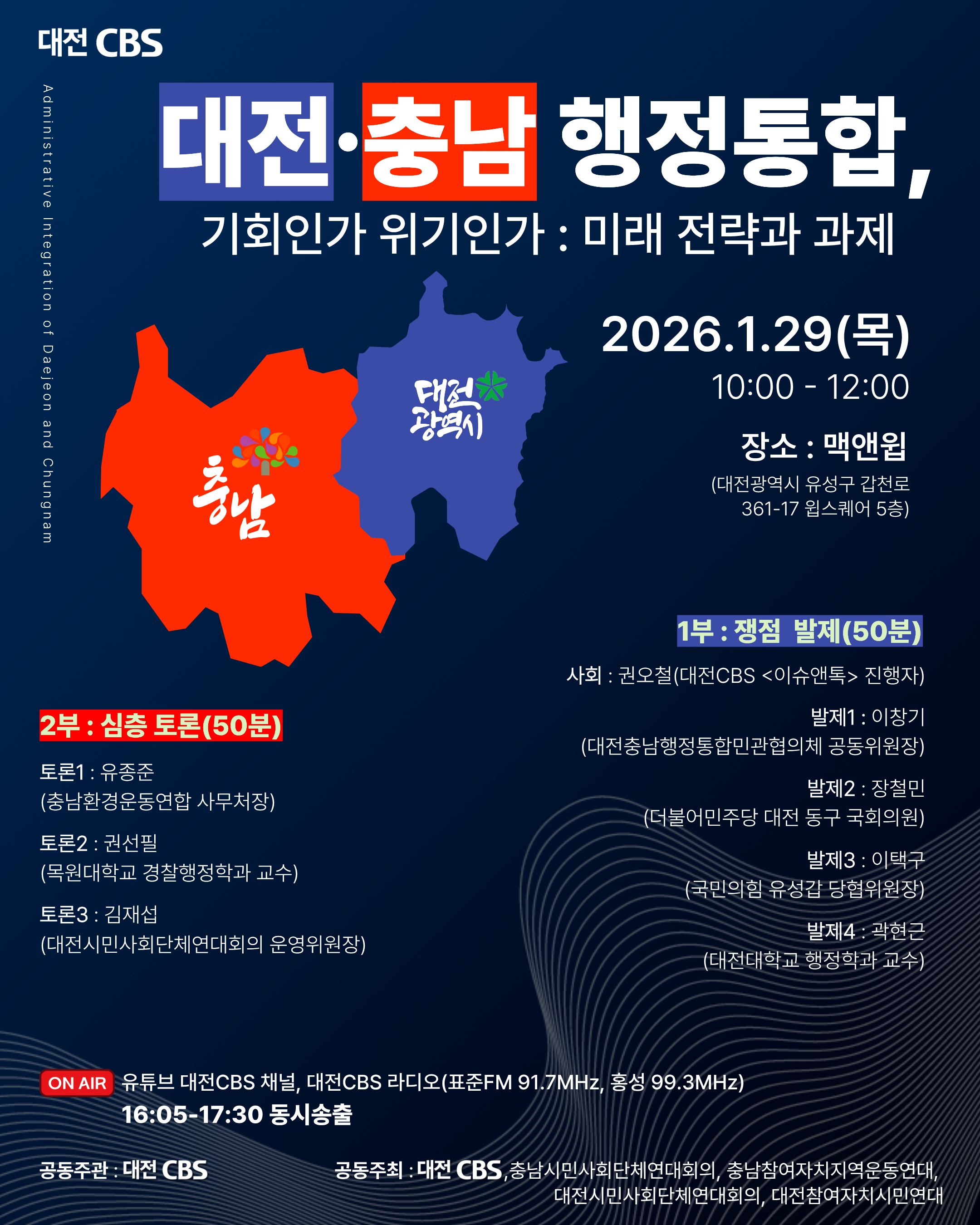 2026년 1월 29일 오전 10시 대전충남통합 토론회를 준비했습니다. 이번 토론회는 대전CBS, 대전시민사회단체연대회의, 대전참여자치시민연대, 대전충남시민사회단체연대회의, 충남참여자치지역운동연대가 함께 준비했습니다. 더불어민주당, 국민의힘, 대전충남통합 민관협의체에서 준비한 법안은 무엇인지, 어떤 내용이 준비되어 있는지 공유하고 의견을 나누는 자리입니다.