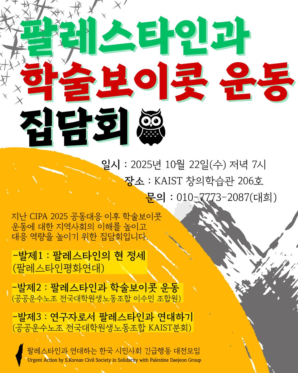 🗣️ 발제 : 팔레스타인 평화연대/대학원생노동조합 이수민 활동가/공공운수노조 전국대학원생노동조합 KAIST분회