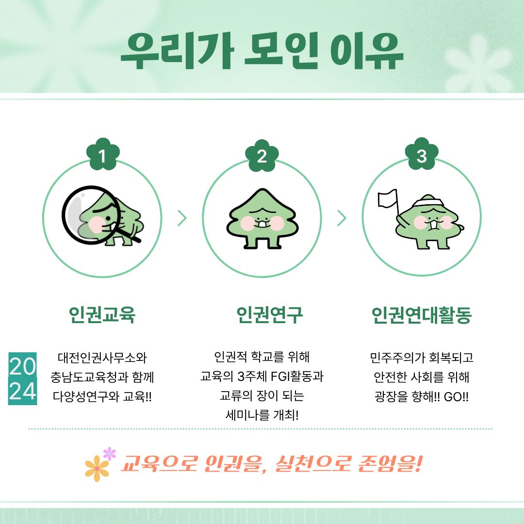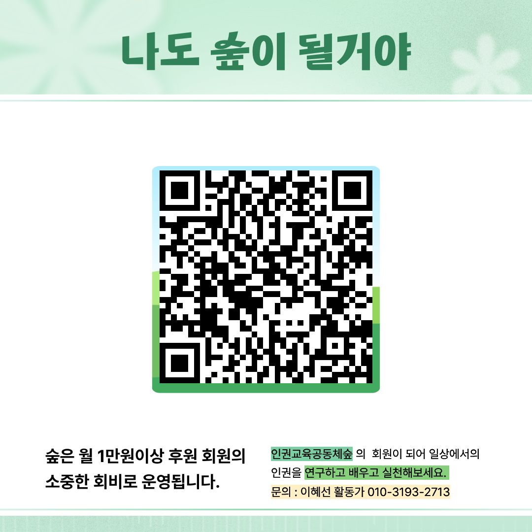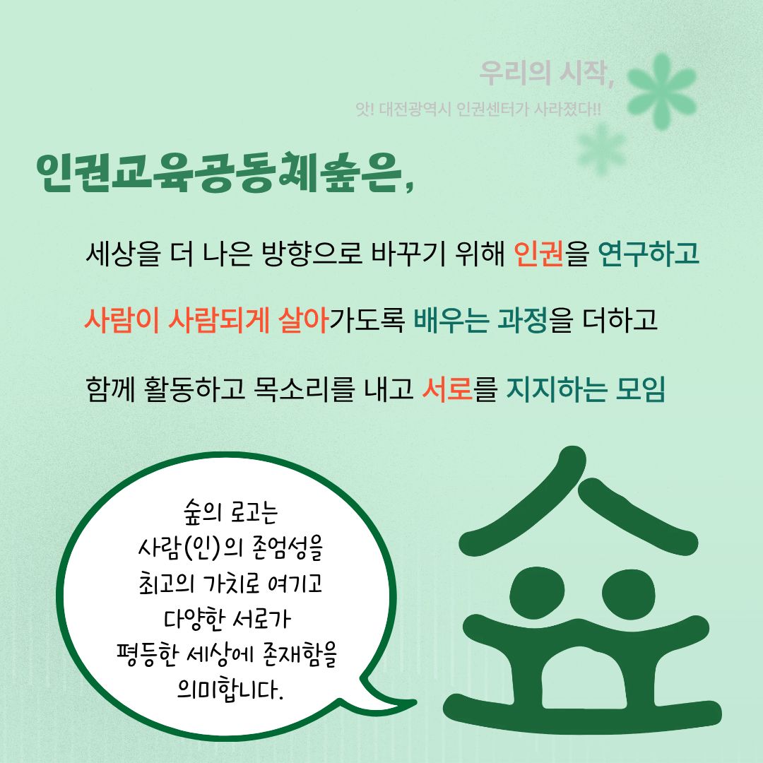 지난 띠모크라시 구독자님이 지역의 시민사회단체 등이 궁금하다는 의견을 주셔서, 앞으로 대전의 단체를 소개하는 시간도 함께 가져보려고 해요. 먼저 띠모와 같이 사무실을 사용하고 있는 인권단체를 소개를 해보려고 해요. 앞으로도 더 많은 지역의 단체를 소개해보도록 할게요! 오늘은 인권교육공동체숲입니다! 인권을 연구하고 다양한 서로가 평등한 세상을 위해 활동하는 숲을 응원해주세요! |